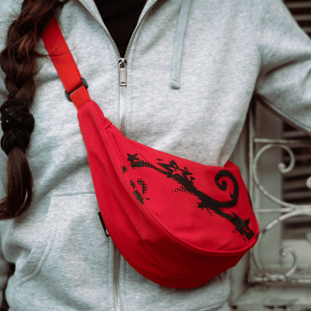 Bolso realizado de nylon reciclado repelente al agua, con compartimento principal espacioso y dos bolsillos interiores. Serigrafia negra.